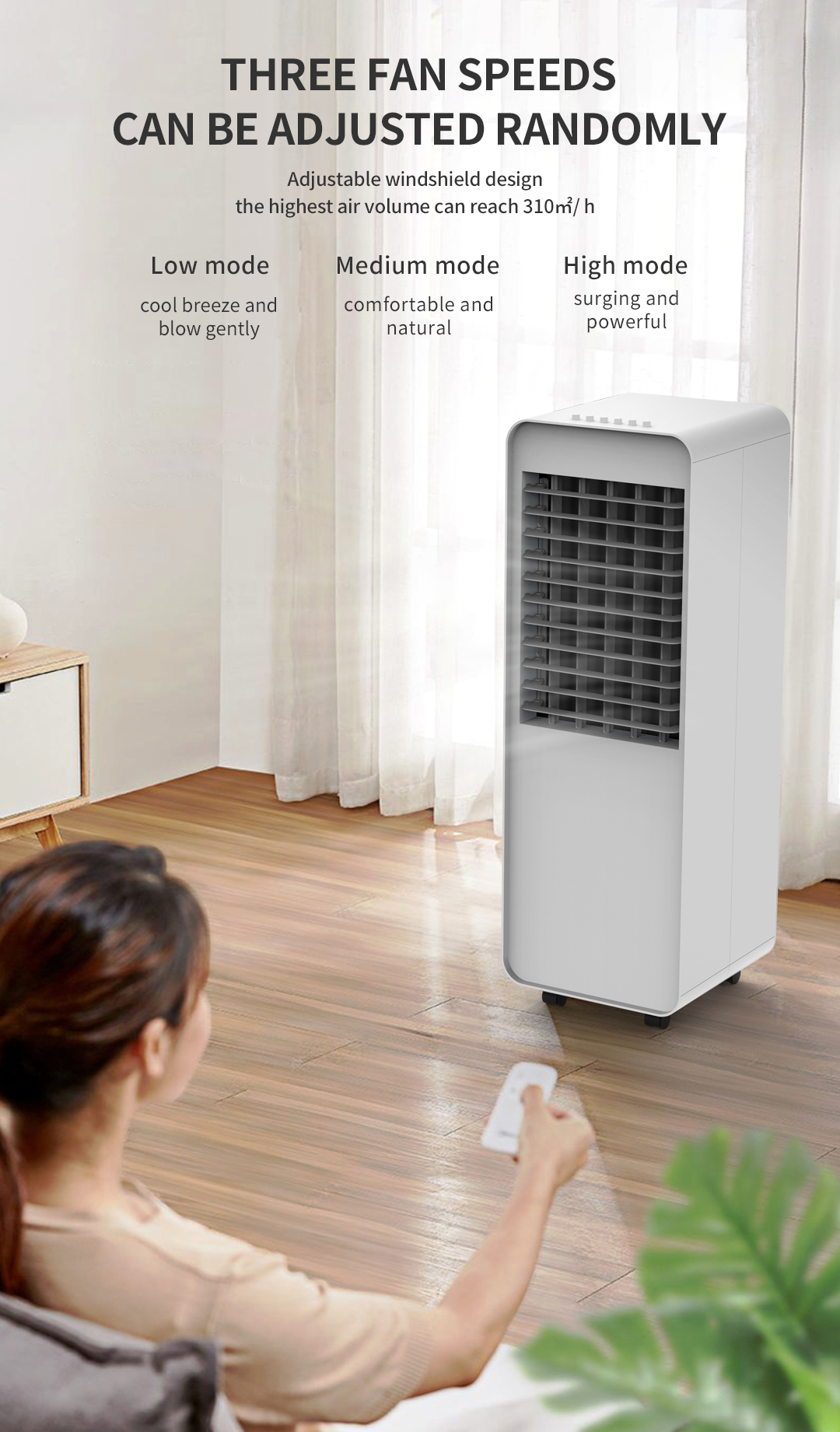 Chế độ thấp: Gió mát và thổi nhẹ nhàng, thời tiết mùa thu vẫn có thể sử dụng quạt điều hòa không khí, vừa phù hợp với thời tiết, vừa kết hợp làm ẩm không khí trong nhà khi thời tiết hanh khô.
