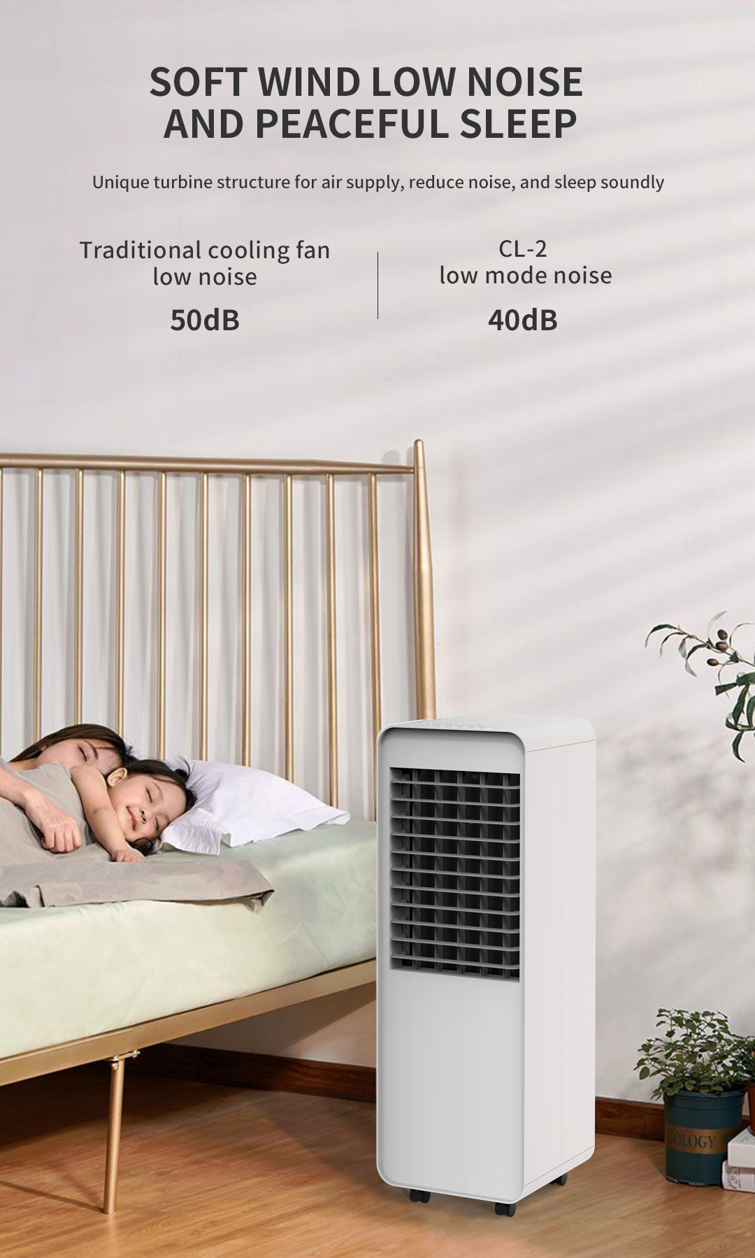 quạt điều hòa Air Cooler được thiết kế rotor đảo gió tối ưu phạm vi sử dụng, rotor đảo gió trái phải 120 độ và trên dưới 45 độ, giúp làm mát mọi nơi trong căn phòng của bạn. Được trang bị cấu trúc tuabin độc đáo, quạt điều hòa Air Cooler có thể tạo gió và làm mát không khí nhanh chóng mà không gây ồn ào. Các thiết kế quạt điều hòa thông thường thiết kế làm giảm tiếng ồn chỉ có 50db, nhưng ở quạt điều hòa Air Cooler phạm vi tiếng ồn chỉ còn 40db giúp bạn dễ dàng đi vào giấc ngủ.