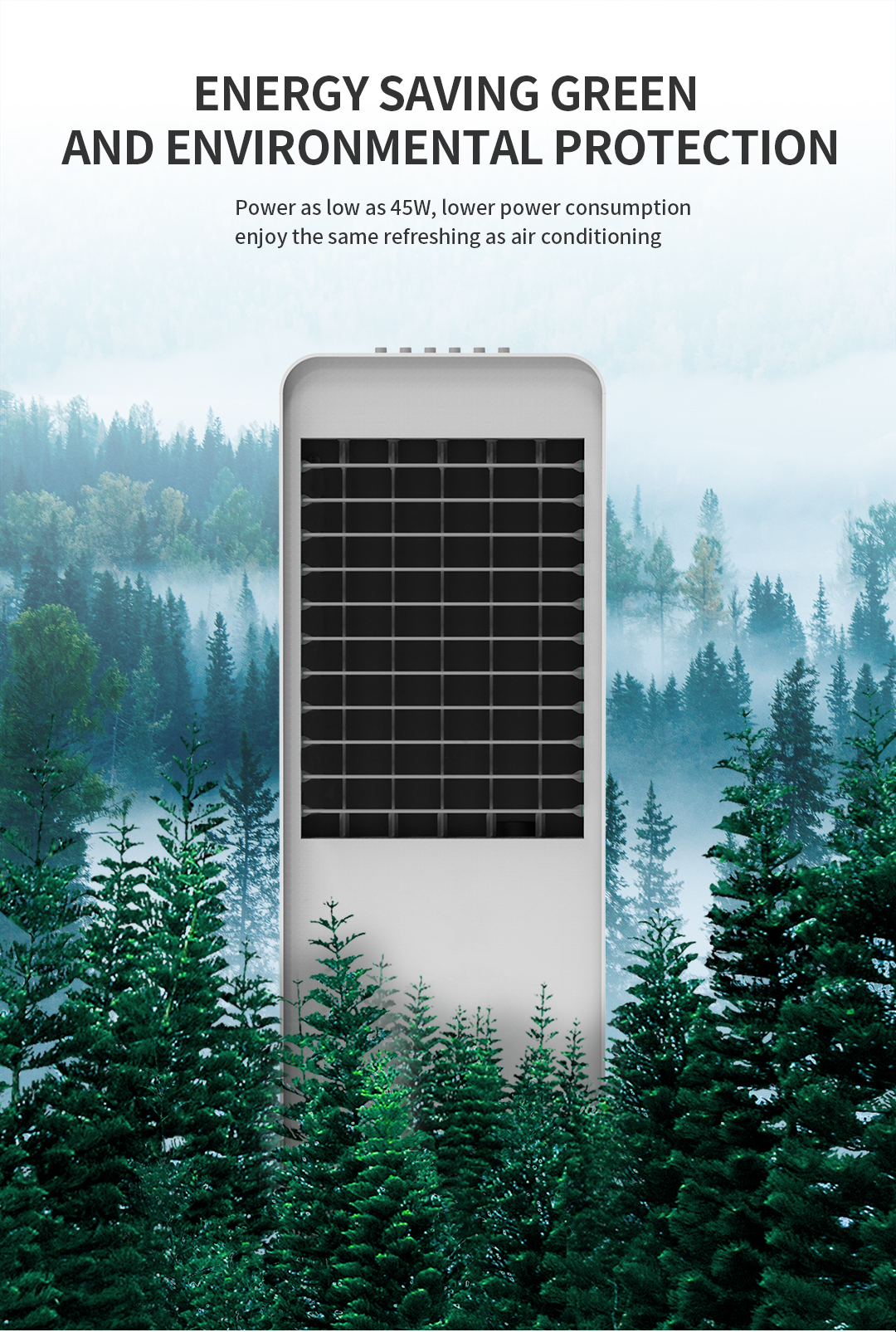 Quạt làm mát Air Cooler có khả năng tạo gió tốt, lấy gió đa chiều, tận dụng hơi nước để làm dịu nhiệt độ bao phủ, lọc sạch không khí bằng các ion âm mang đến cho căn phòng của bạn một nguồn gió mát tự nhiên, sạch khuẩn và an toàn. Công suất 45W giúp tiết kiệm điện năng, góp phần bảo vệ môi trường và tiết kiệm năng lượng xanh.