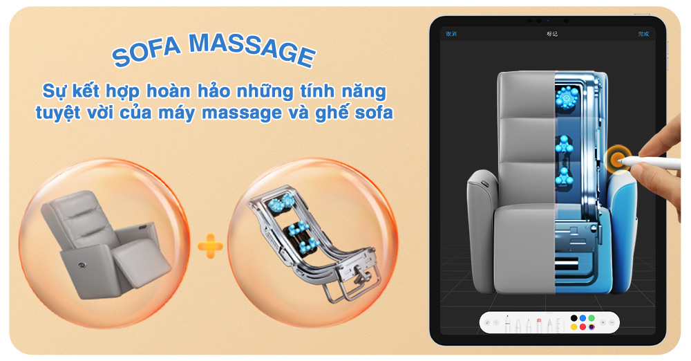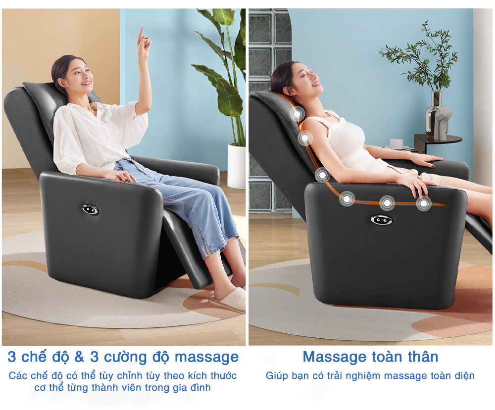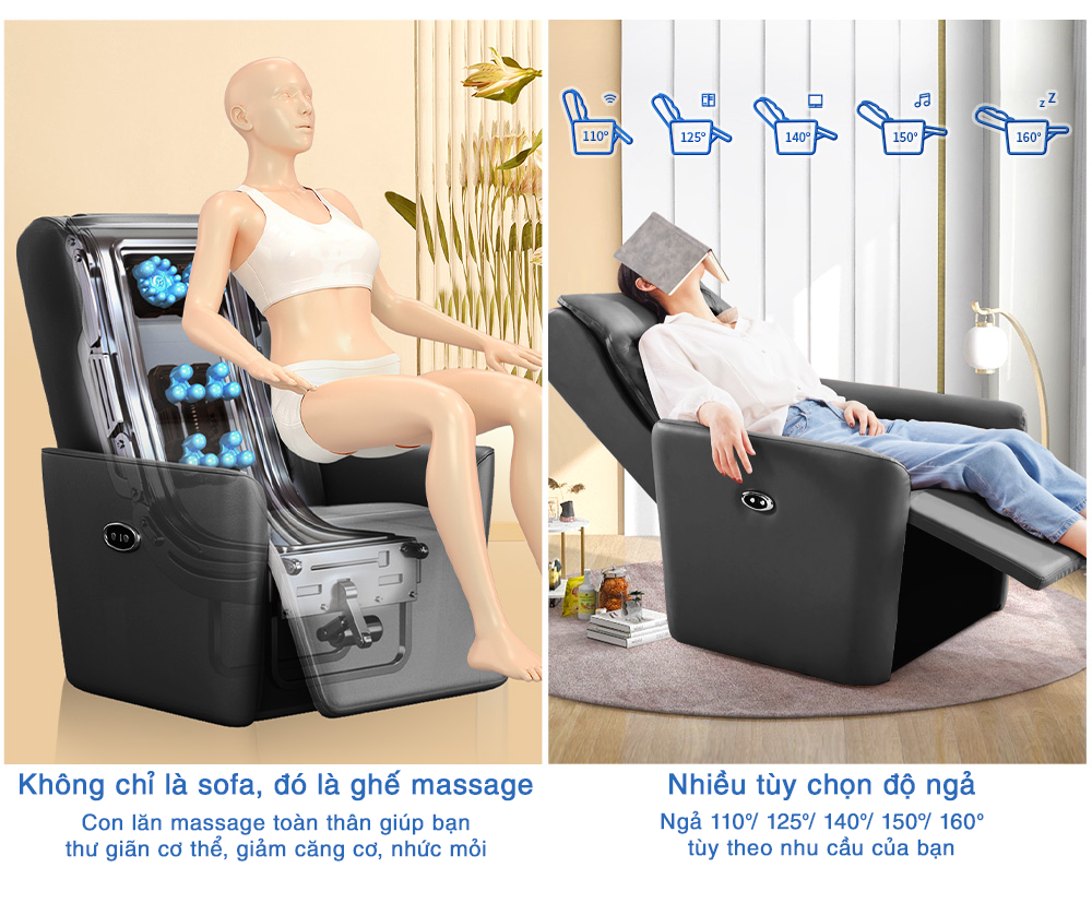 Sofa massage có thể ngồi, ngả lưng, nâng chân giúp bạn thoải mái & thư giãn hơn sau những giờ làm việc học tập căng thẳng.