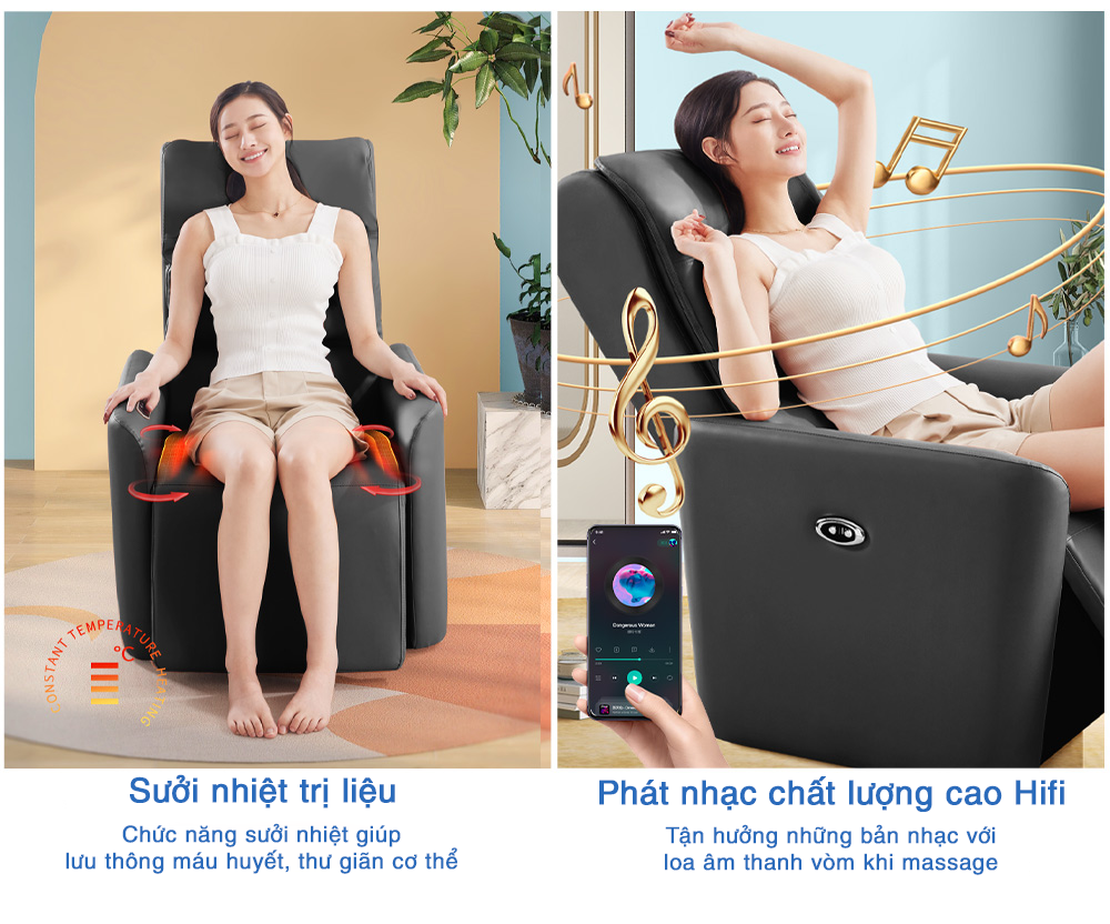 Ghế còn có thể kết nối bluetooth với các thiết bị điện tử để phát nhạc, giúp bạn tận hưởng những bài hát yêu thích khi trải nghiệm massage.