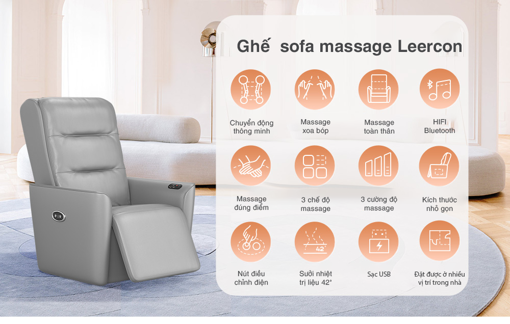 Sofa massage Leercon LEK 988M2, phù hợp sử dụng trong phòng khách ngồi giải trí đọc sách, coi phim, ngả lưng...