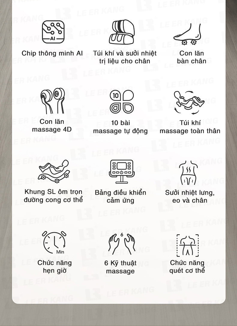 Ghế massage cao cấp LEK 988C9 được thiết lập sẵn 10 chương trình mát xa trí tuệ nhân tạo phù hợp với tất cả thành viên trong gia đình và 6 phương pháp kết hợp massage truyền thống và hiện đại đã được cấp bằng sáng chế: Shiatsu, đấm, bóp, vỗ, ấn huyệt, kết hợp đấm bóp.