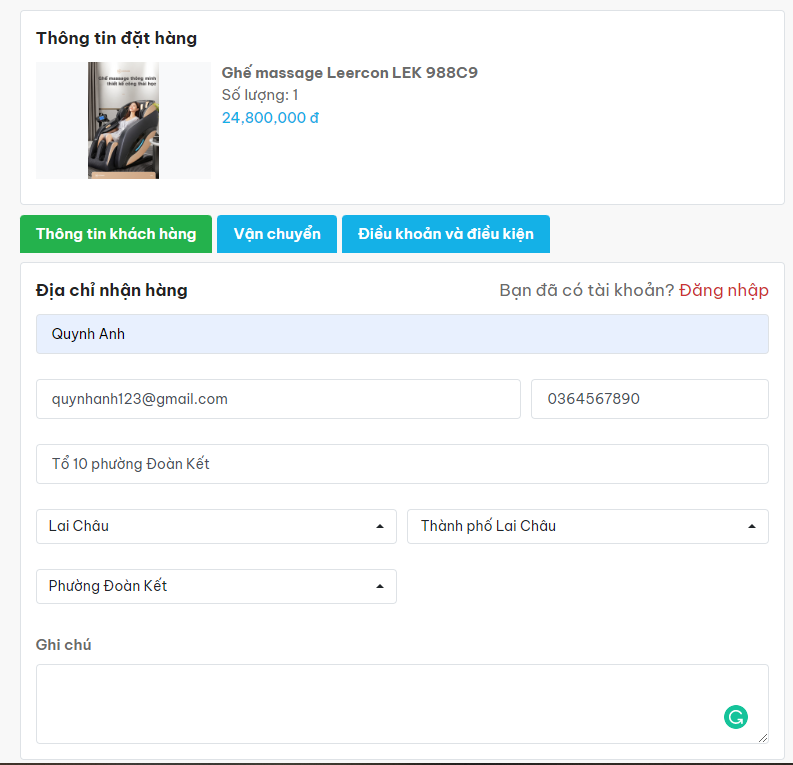 Bước 4: Điền đầy đủ thông tin nhận hàng gồm: Họ tên, email, số điện thoại, địa chỉ và ghi chú (Nếu có)