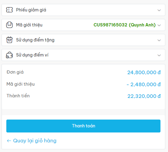 Bước 6: Sử dụng các ưu đãi giảm giá, điểm thưởng (nếu có) và bấm chọn “Thanh toán”