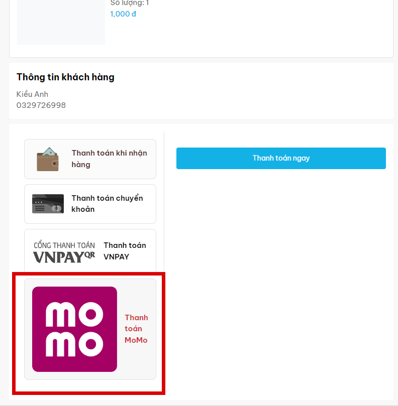 Lựa chọn hình thức thanh toán "Thanh toán MOMO"