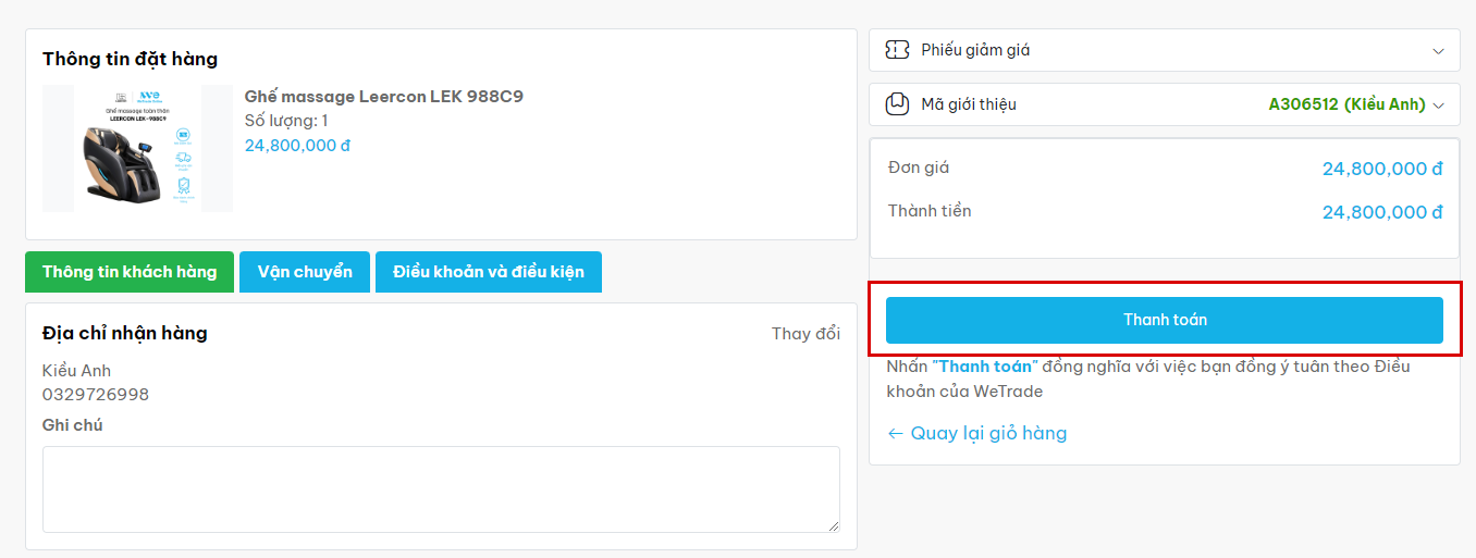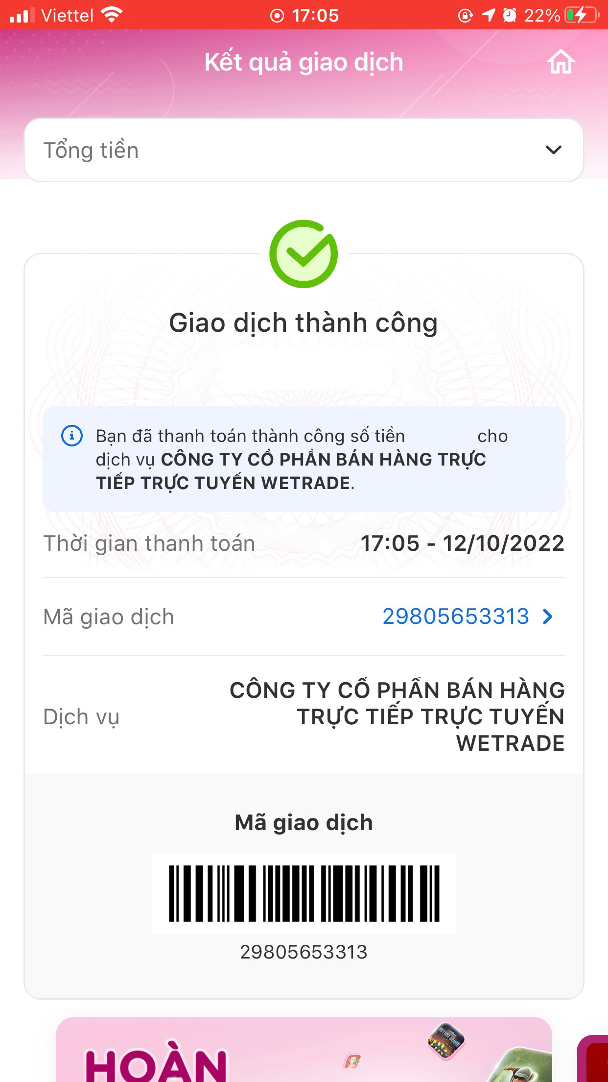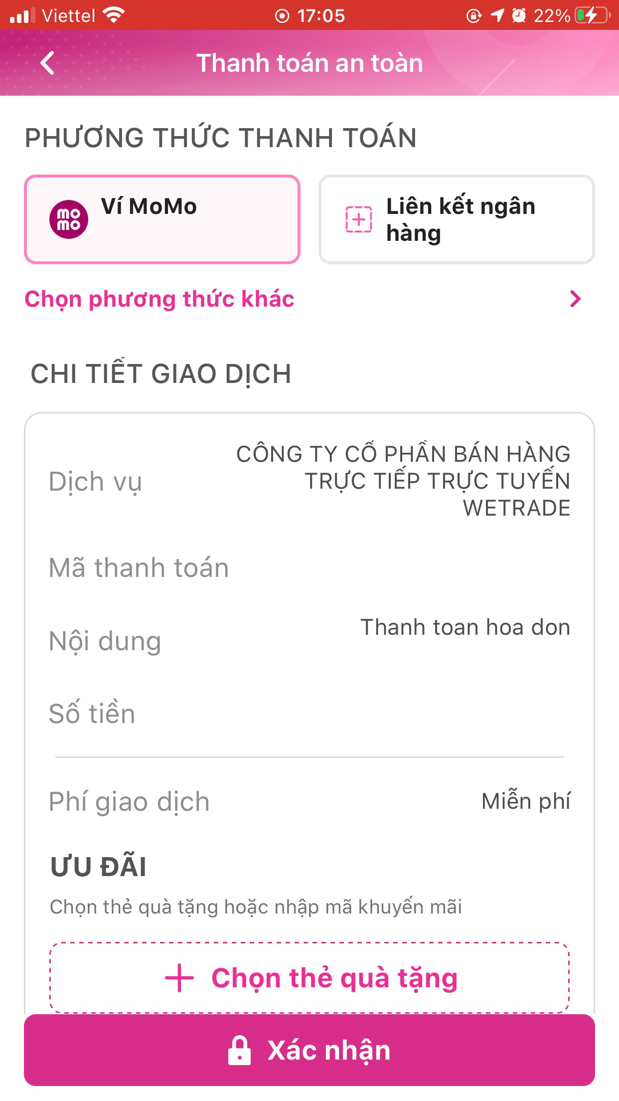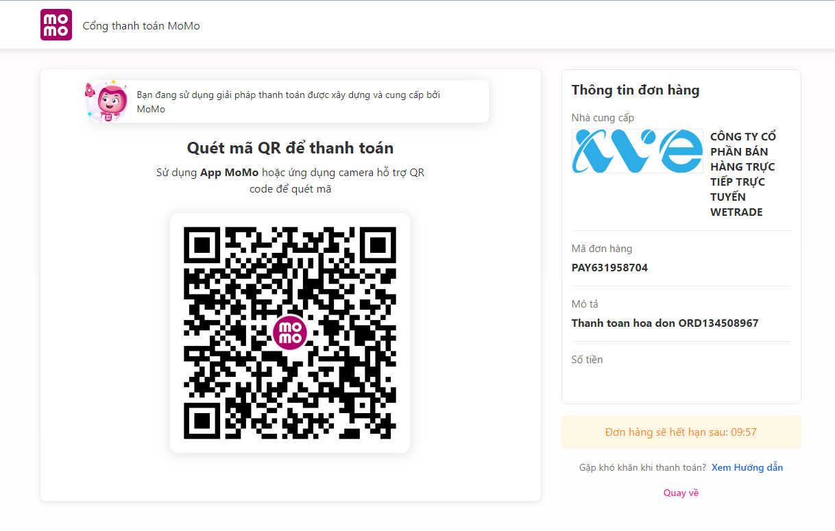 Ngoài các hình thức thanh toán bằng tiền mặt khi nhận hàng (COD) các loại voucher, WeTrade đã tích hợp phương thức Thanh toán trực tuyến qua cổng thanh toán ví điện tử MOMO và hoàn toàn miễn phí giao dịch.