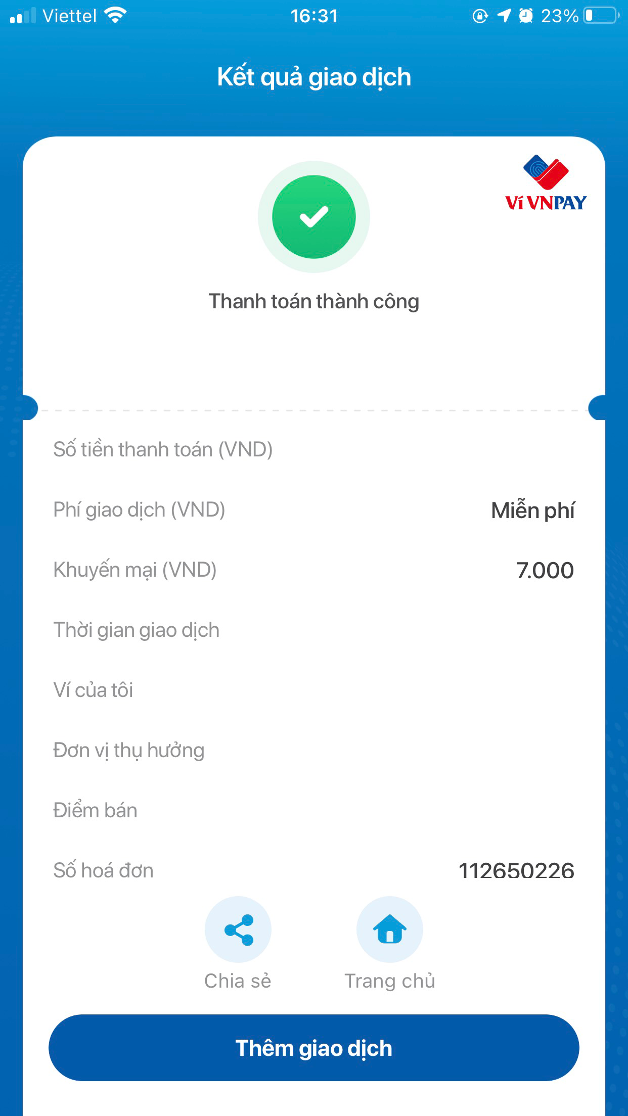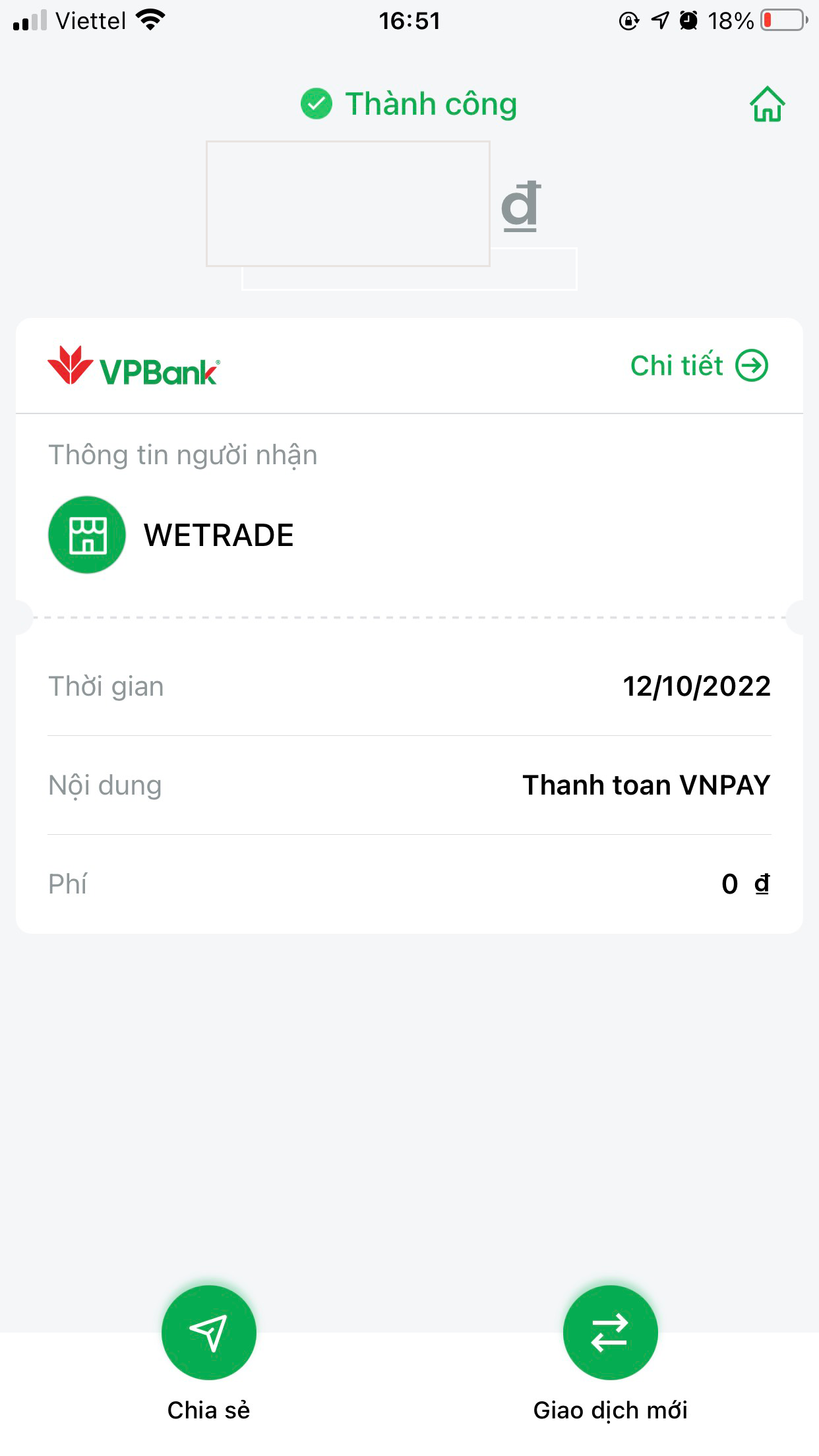 Ngoài các hình thức thanh toán bằng tiền mặt khi nhận hàng (COD) các loại voucher, WeTrade đã tích hợp phương thức Thanh toán trực tuyến (Internet Banking, VNPAY-QR, Ví điện tử VNPAY, Visa - Miễn phí thanh toán) qua cổng thanh toán VNpay và hoàn toàn miễn phí giao dịch.