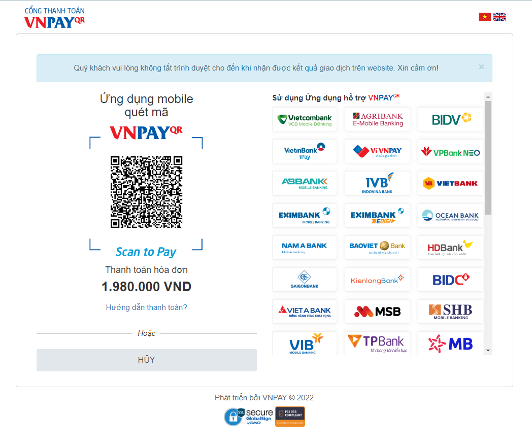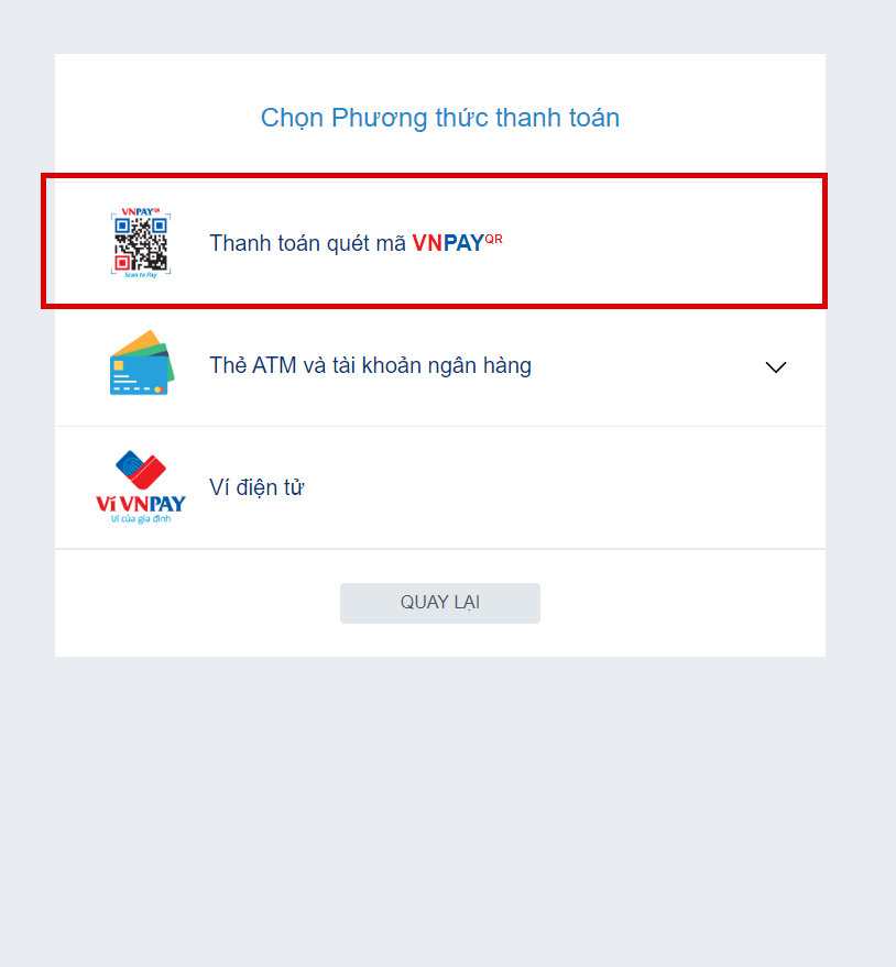 Lựa chọn hình thức thanh toán và nhập thông tin hoặc quét mã QR thanh toán bằng ứng dụng ví VNPAY
